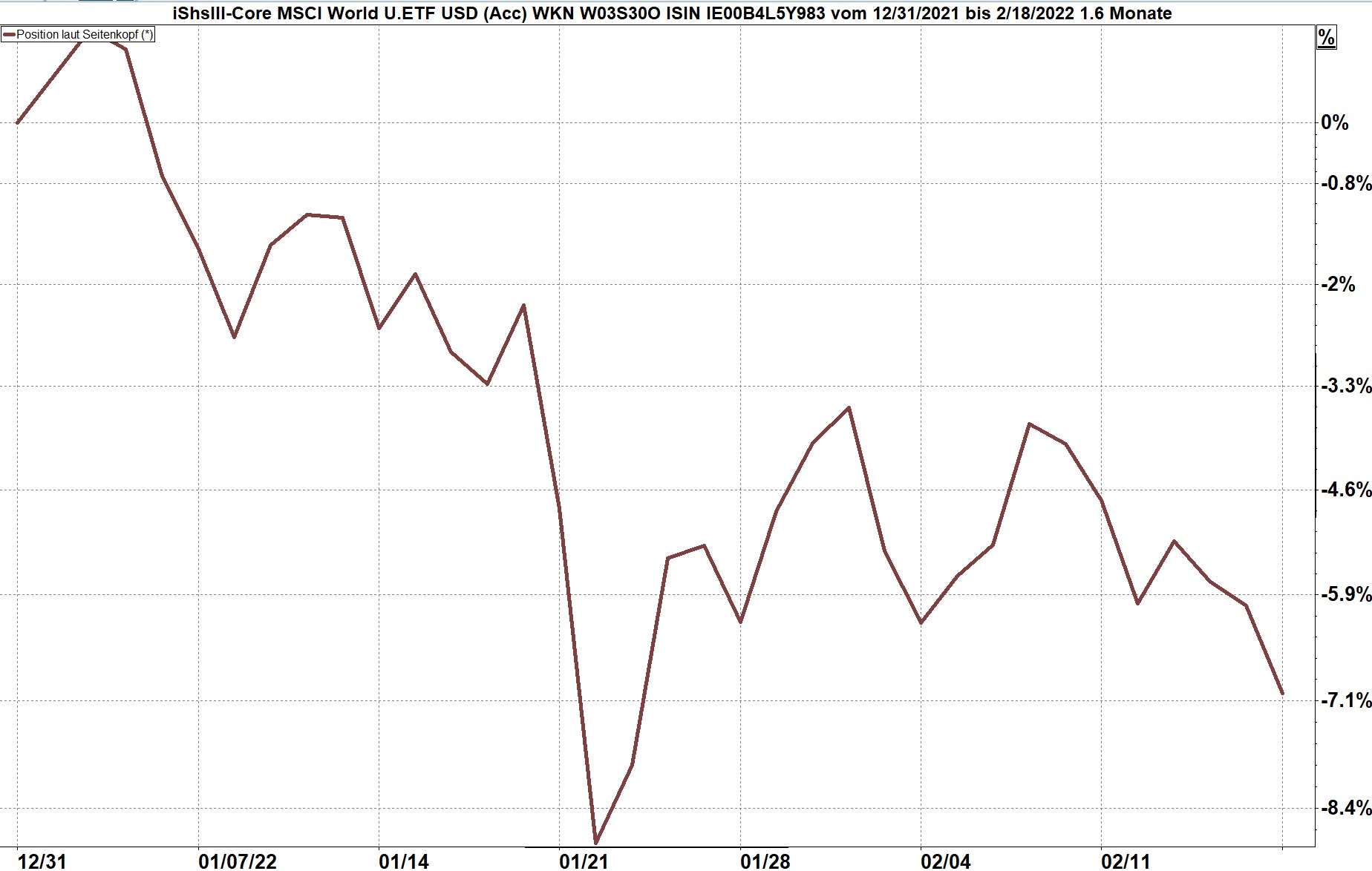 Die Bewertung des Weltaktienindex ging zwischen dem Jahresendstand 2021 und dem 18.2.2022 um sieben Prozent zurück.