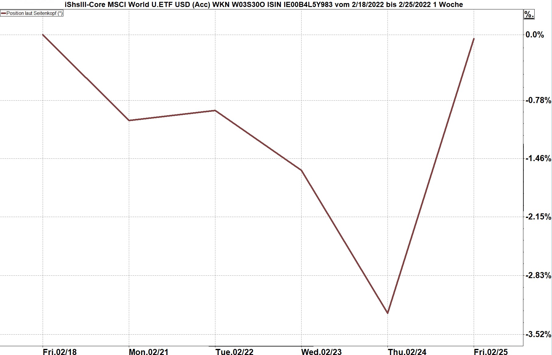 Dann überraschte Russland die Welt mit einem militärischen Angriff auf die Ukraine. Viele Investoren reagierten hektisch. Der S&P 500 (Index der 500 größten Aktiengesellschaften der USA) verlor Innerhalb von weniger als 24 Stunden 5 % seiner Bewertung.