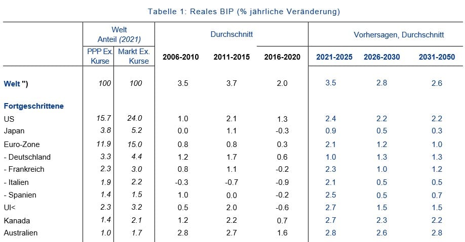 In den Jahren 2021 bis 2025 wächst das Welt-BIP etwas stärker als in den vorangegangenen fünf Jahren. In folgenden Fünf-Jahres-Zeitraum müssen wir uns auf ein geringeres, jedoch weiterhin positives Wirtschaftswachstum einstellen.