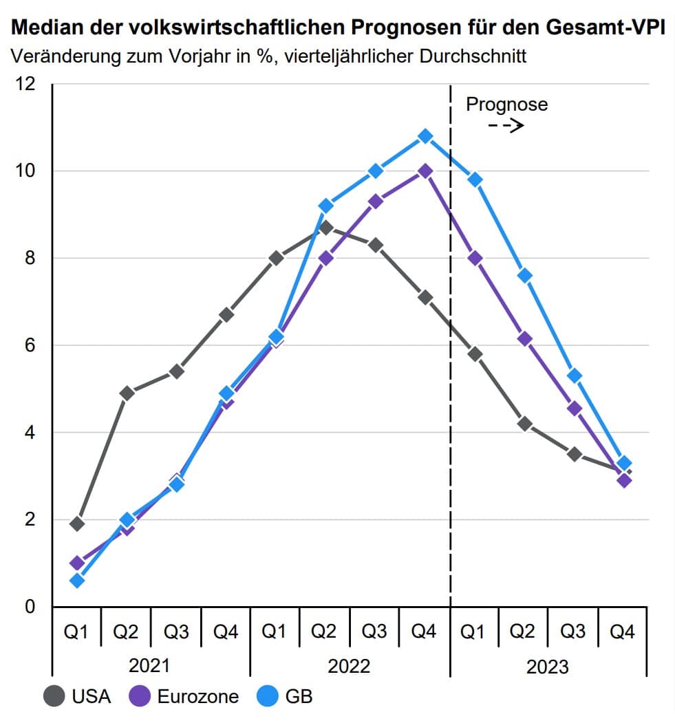 Der Anstieg des VPI hat seinen Höhepunkt überschritten. In den USA war dies bereits im zweiten Quartal, in der Eurozone im vierten Quartal 2022. Bis Ende 2023 sagen die Volkswirte einen VPI von 3 % voraus. Dies wird zu einer Lockerung der Geldpolitik führen, was in der Regel steigende Aktienkurse zur Folge hat.