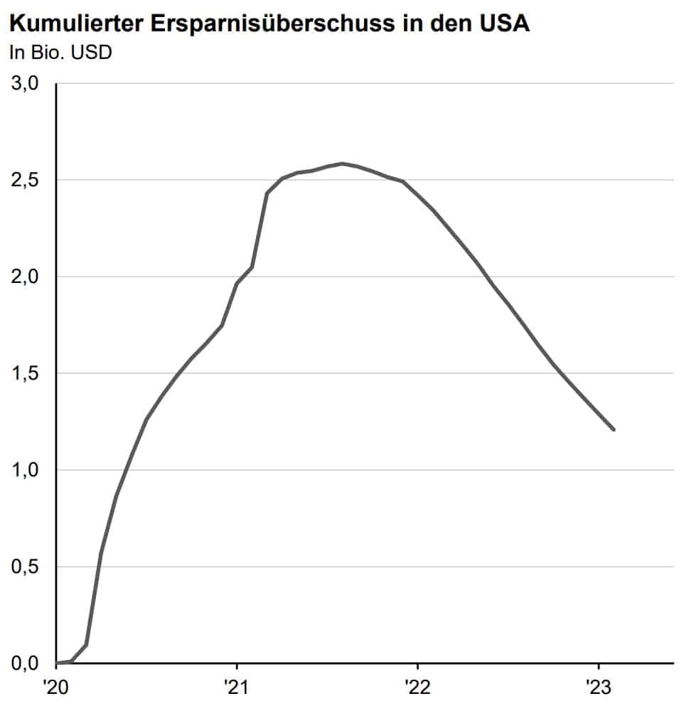 Während der Covid-bedingten Lockdowns bauten die Konsumenten in den USA über 2,5 Billionen (2.500 Milliarden) USD an zusätzlichen Ersparnissen auf. Sie erinnern sich: Die Möglichkeiten, Geld (z.B. für Restaurants und Reisen) auszugeben, waren sehr beschränkt. Gleichzeitig erhielten Millionen von US-Bürgern sehr großzügige Leistungen vom Staat, so dass deren Einkommen während der Zeit der Arbeitslosigkeit höher war als zuvor. Der daraus entstandene Ersparnisüberschuss baut sich seit Ende 2021 wieder ab und beflügelt den Konsum. Dies ist eine wesentliche Stütze der US-Wirtschaft, die allerdings in den nächsten Monaten auslaufen wird.