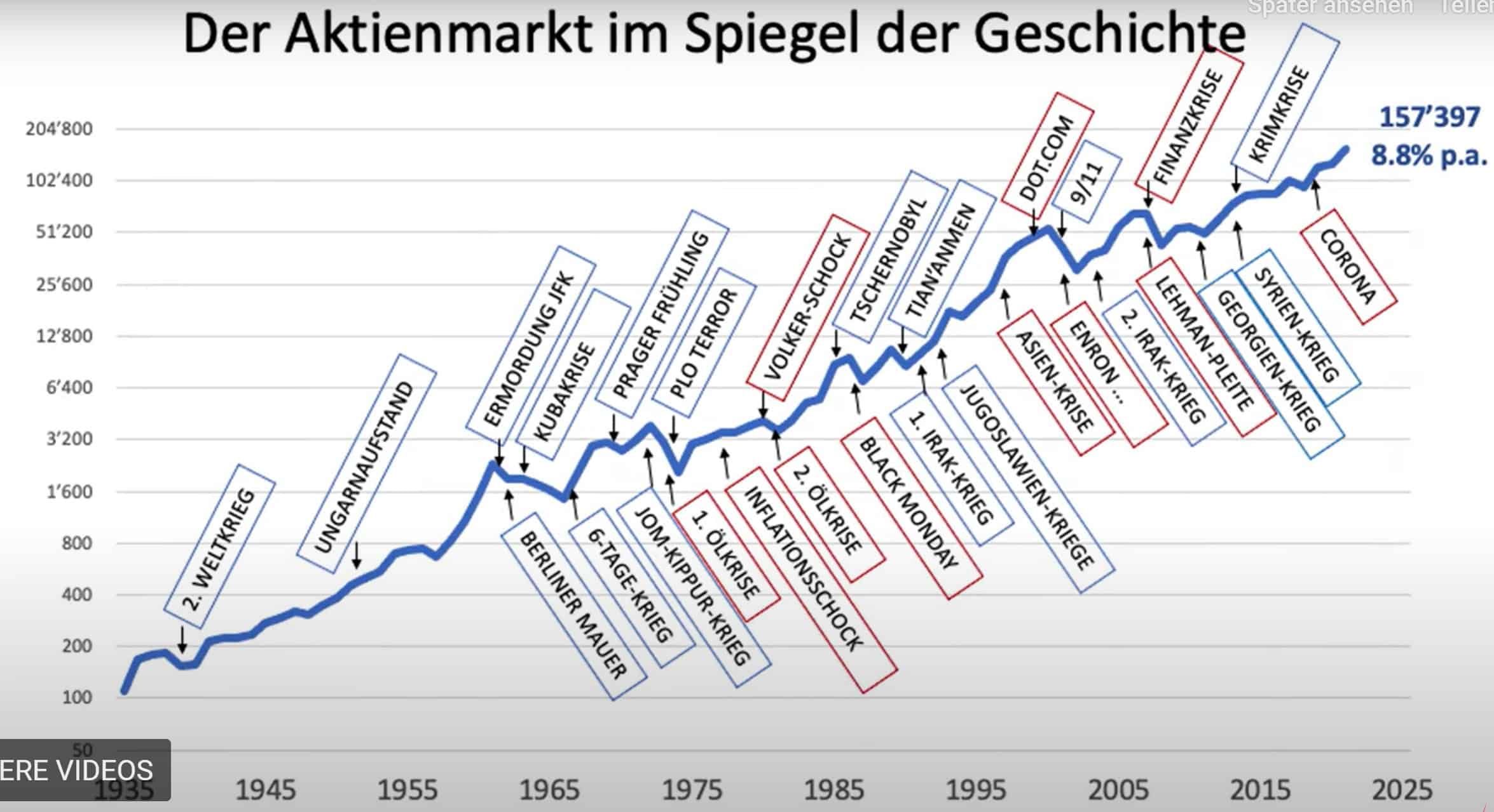 Bei all‘ diesem Pessimismus muss der Hinweis eingebracht werden, dass sich die Aktienmärkte in den vergangenen neunzig Jahren schon häufig nach unten bewegt haben. Die Übersicht, die Prof. Dr. Heri (Universität Basel) in seinem Informationstool „FinTool“ veröffentlicht, zeigt, wie die Aktienmärkte über diesen langen Zeitraum schon zahlreiche Krisen überstanden und über die gesamten Zeitraum zu einer ansehnlichen Rendite für die Anleger geführt haben.