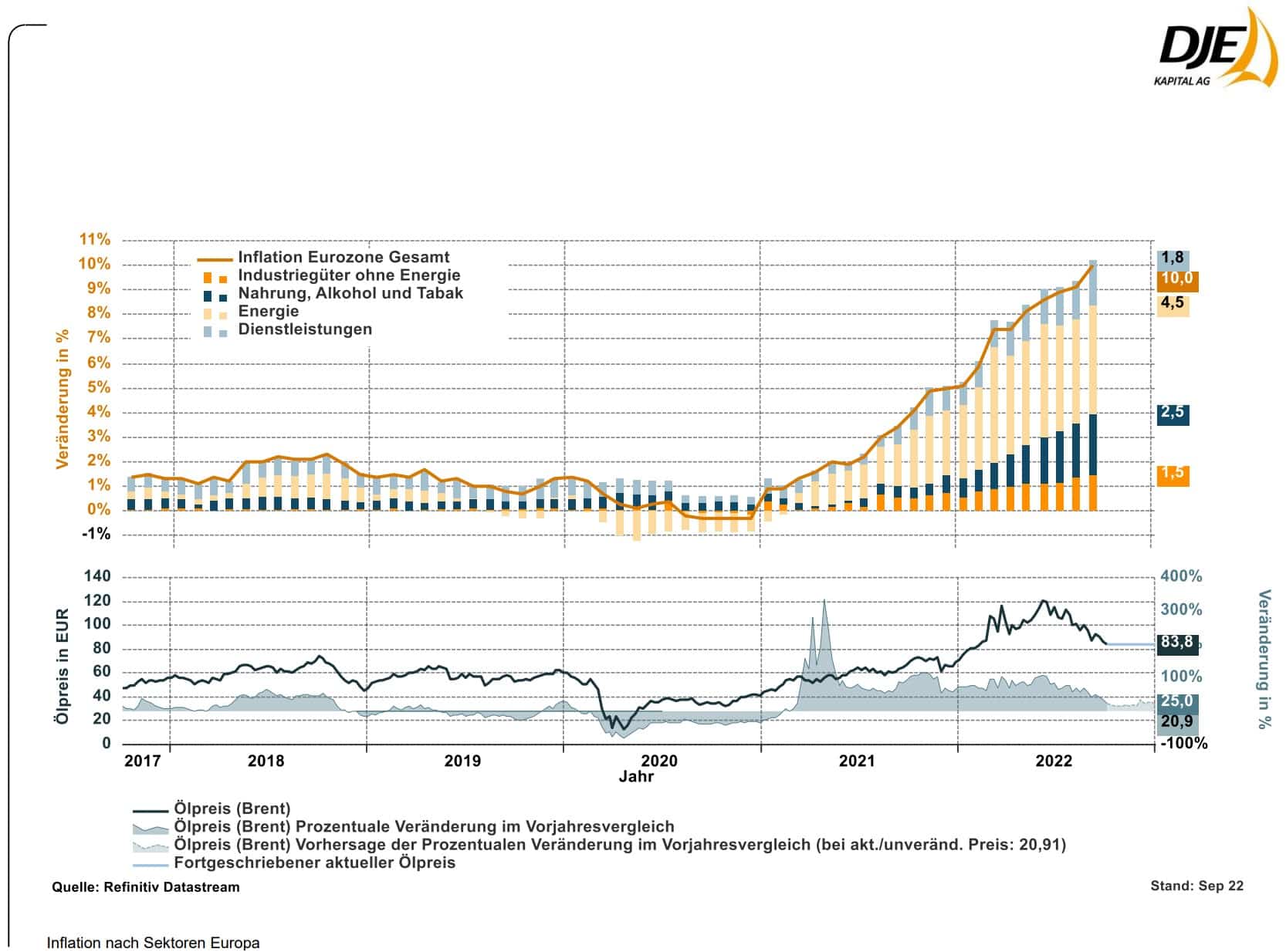 Das folgende Schaubild zeigt, wie stark die Gesamtinflation in der Eurozone durch die Preissteigerung für Energie nach oben getrieben wurde (gelber Teil der Säulen, siehe rechter Rand der Grafik). Daraus ist unschwer abzuleiten: sobald die Energiepreise wieder zurückgehen, wird – mit etwas Verzögerung – auch die Inflationsrate wieder sinken.