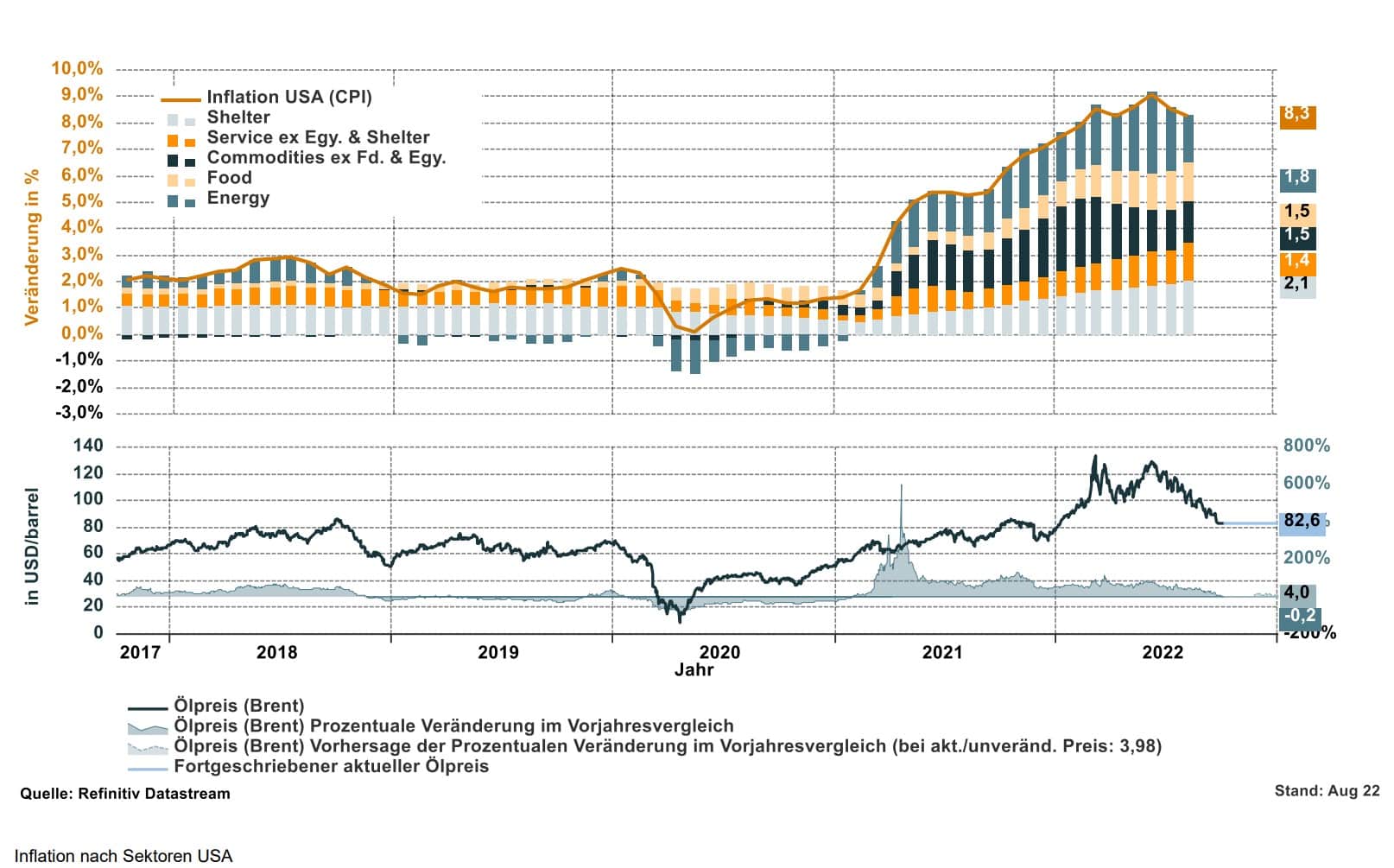 Die rechte Grafik liefert uns eine Übersicht, welche Ursachen die Inflation in den USA hat. Wir erkennen daraus: