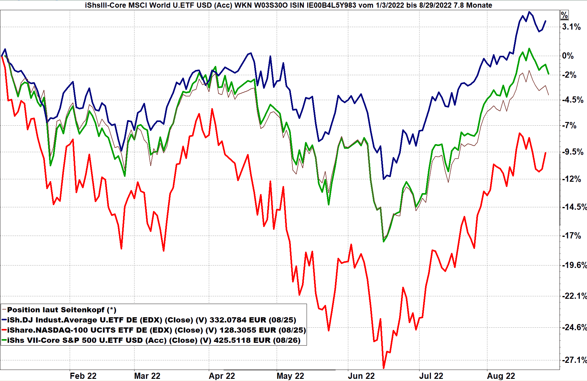 Grafik: Dow Jones Industrial, S&P 500 und Nasdaq 100. Dünne braune Linie: Weltindex zum Vergleich. Im Dow Jones und im Nasdaq ist der letzte Datenpunkt der 25.8. Der Rückgang nach der Rede von Jerome Powell am 26.8. ist daraus noch nicht ersichtlich. – Alle Kurse in Euro bewertet.