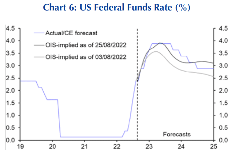 - Blaue Linie: Prognose von Capital Economics per 26.08.2022