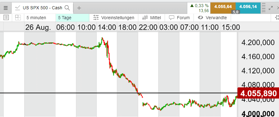 Bis zum Börsenschluss fiel der S&P 500 um etwa 200 Punkte. Die Eröffnung am nächsten Börsentag (Montag, den 29.08.22) lag noch etwas tiefer.