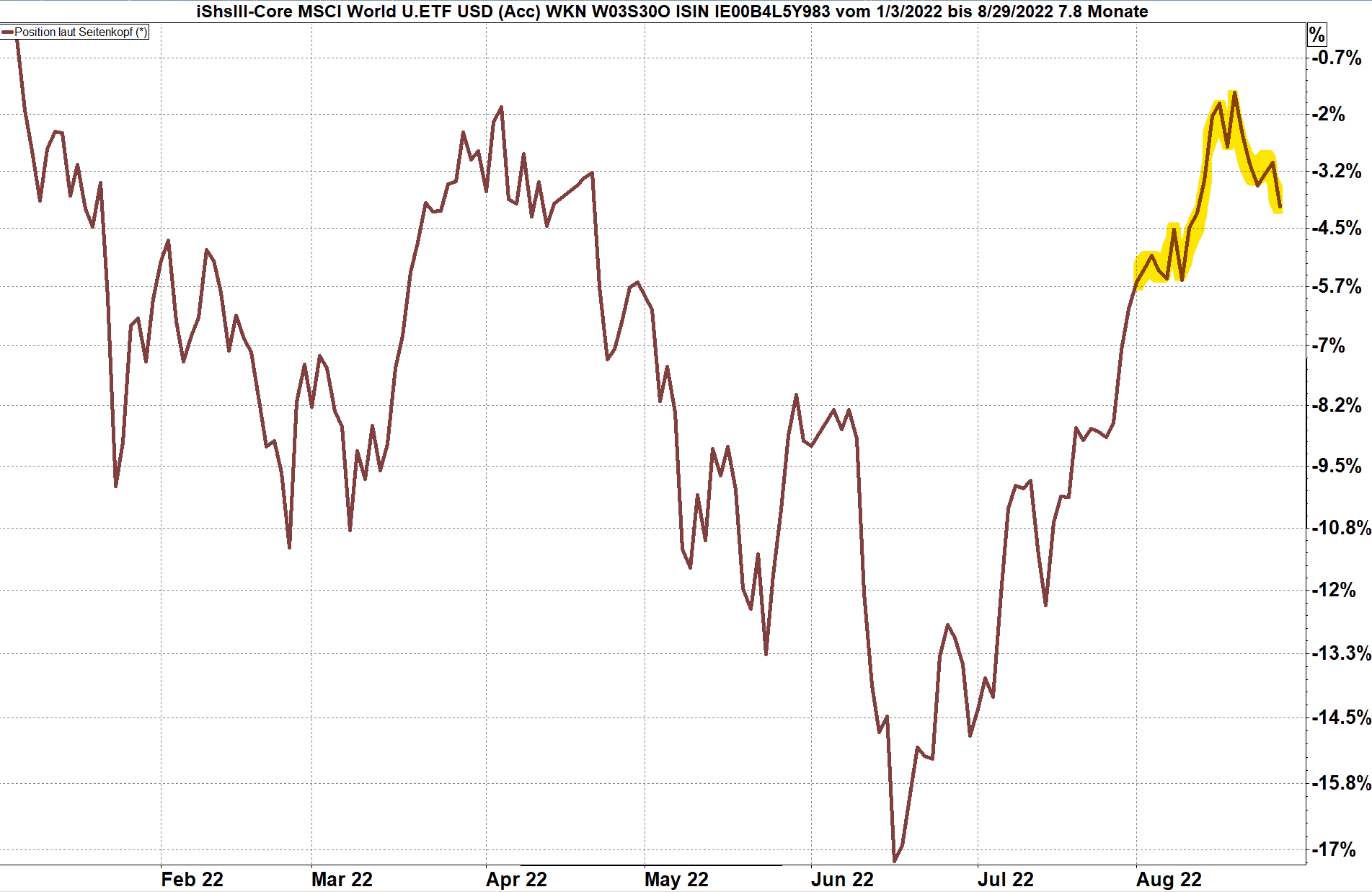 Die folgende Grafik zeigt die Entwicklung des Weltaktienindex mit seinen über 1.500 Positionen aus 23 Industrieländern von Januar bis 26. August 2022.
