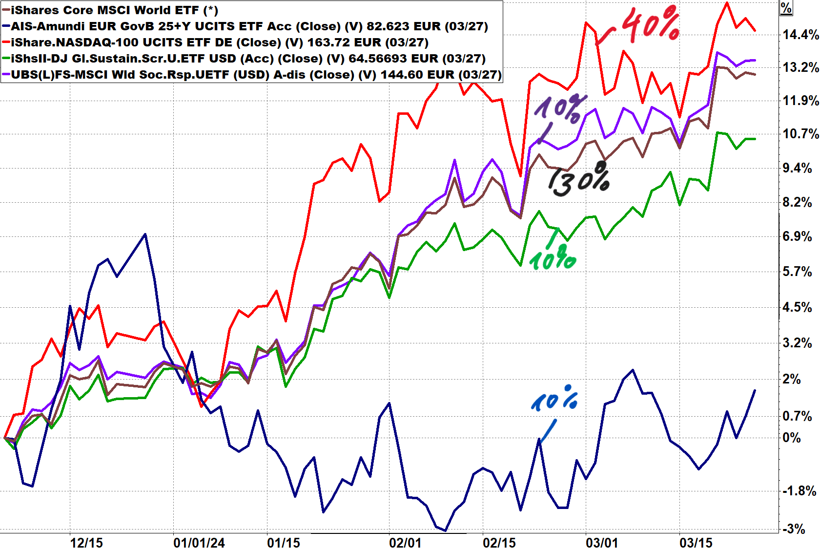 Das Portfolio blieb seit Anfang Dezember 2023 unverändert. Der Fokus mit 40 % auf die Technologie-Unternehmen, die alleine im iShares ETF auf den Nasdaq 100 mit über 50 % Anteil vertreten sind, hat sich ausgezahlt. Im im ETF auf den Weltindex sind Technologiewerte mit fast 25 % vertreten.