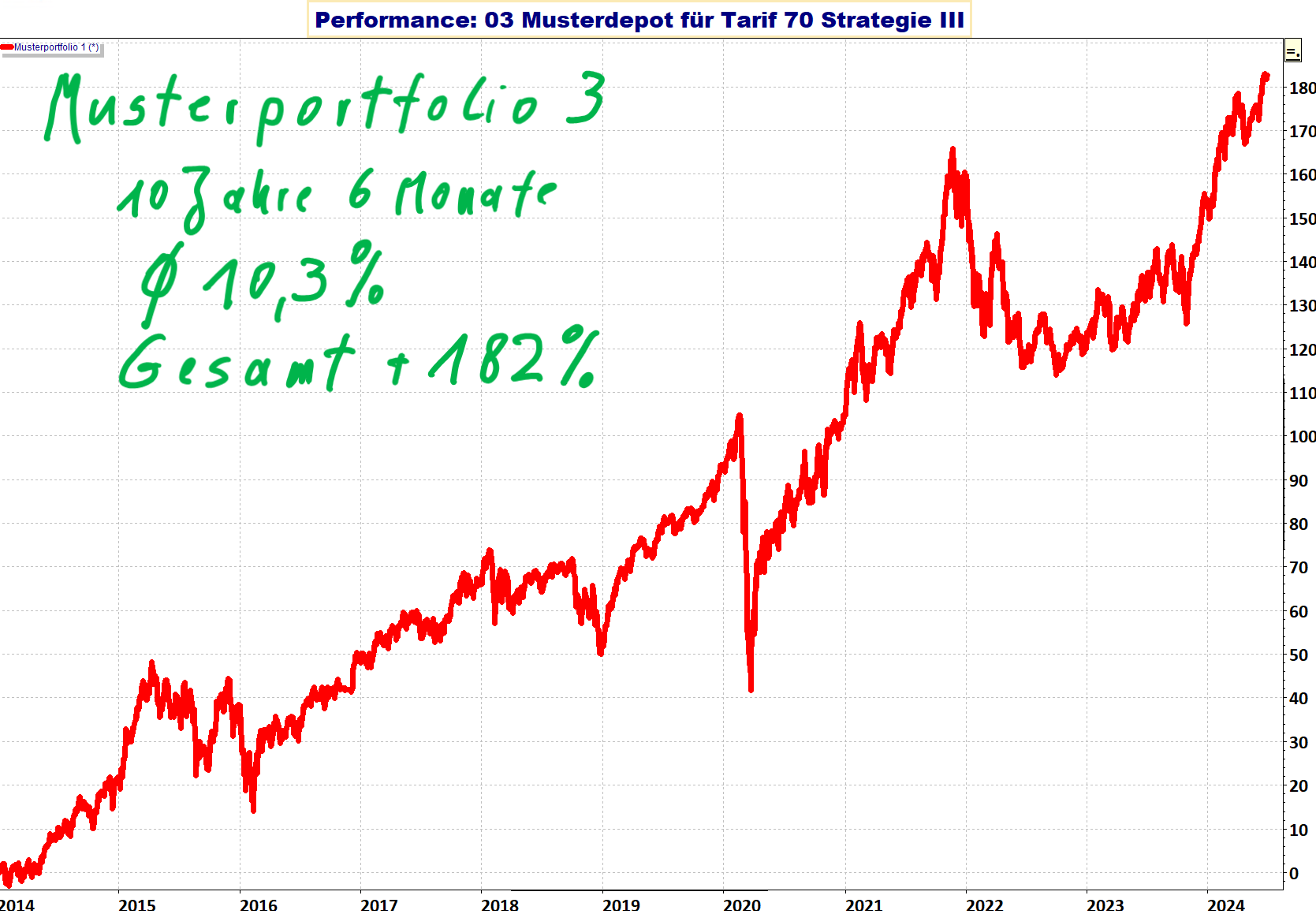 Das Musterportfolio, das als Ideenlieferant für die Allokation im steuerbegünstigten Versicherungsmantel „LVL70“ dient, erreichte bis 27. Juni 2024 einen Wertzuwachs von 182 %. Dies entspricht einem durchschnittlichen Wertzuwachs von 10,3 % seit dem Start dieses Portfolios Anfang 2014.