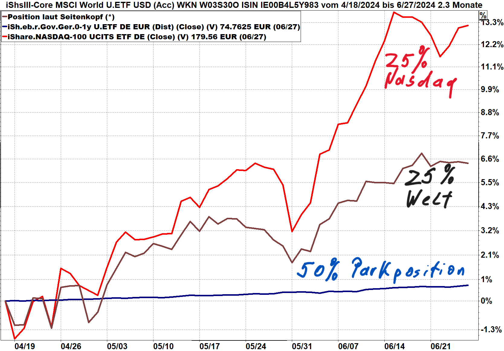 Schaubild: Die drei Positionen des Musterportfolios vom 18.4. bis 27.6.24