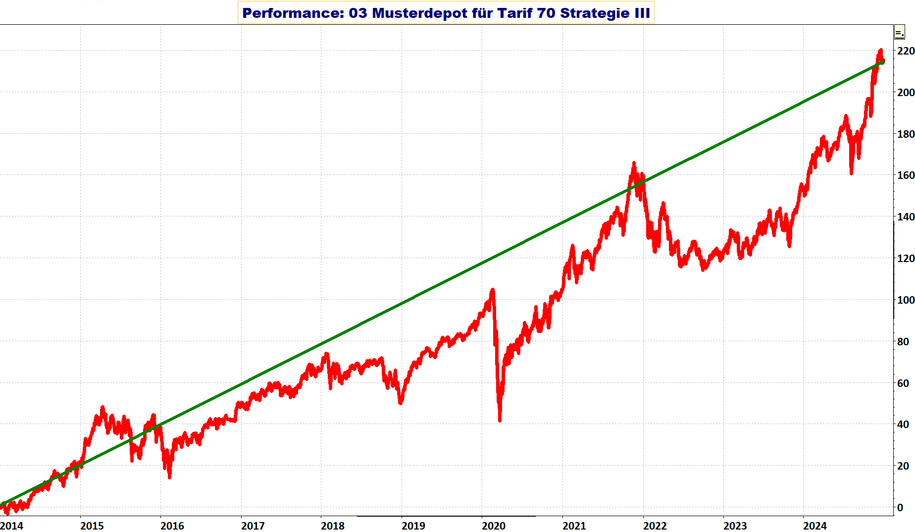 Musterportfolio für Tarif LVL70: 220 % plus, 11,1 % pro Jahr
