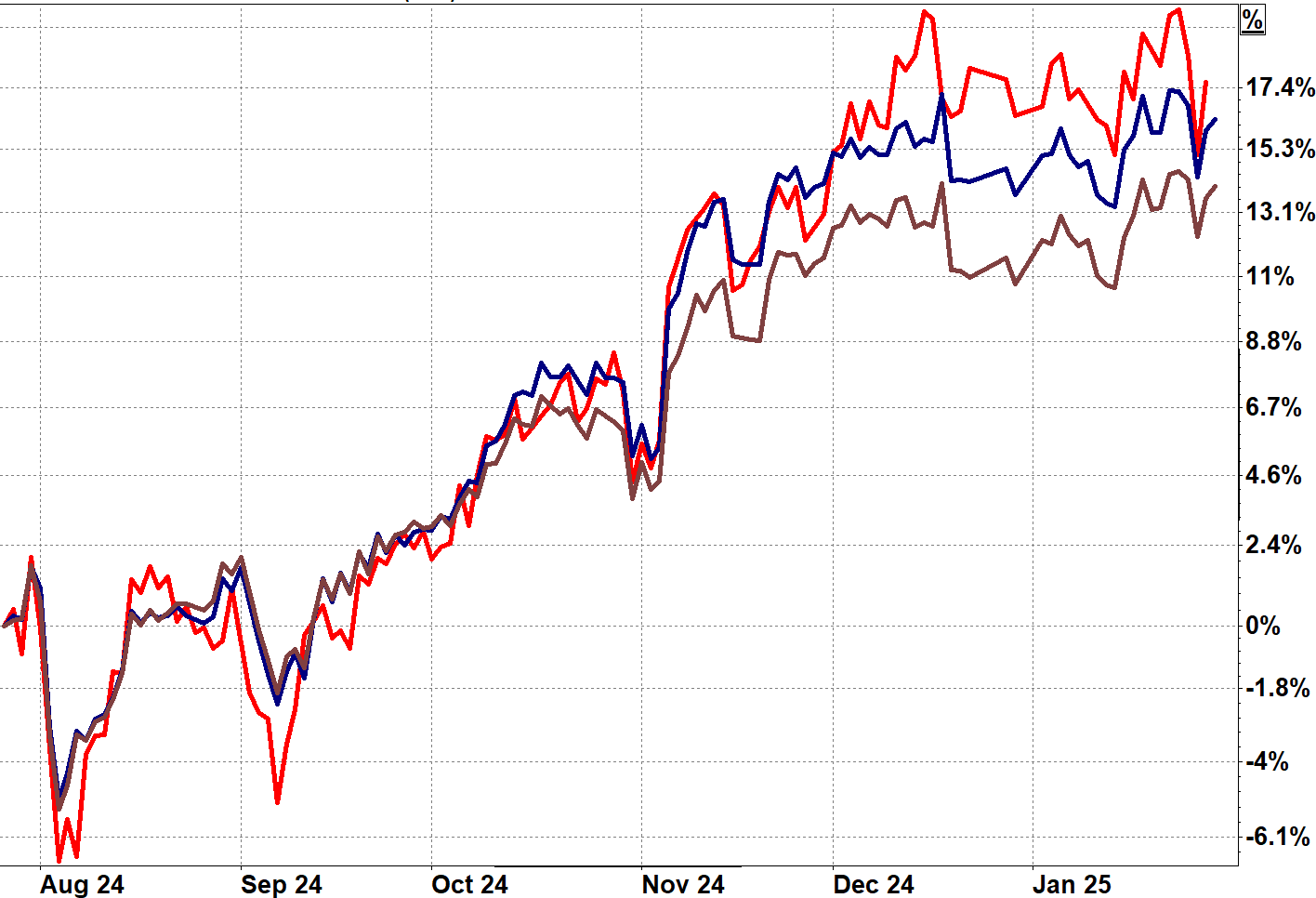 Hier die Wertentwicklung der drei Positionen des Musterportfolios vom 26.07. bis 29.01.25: