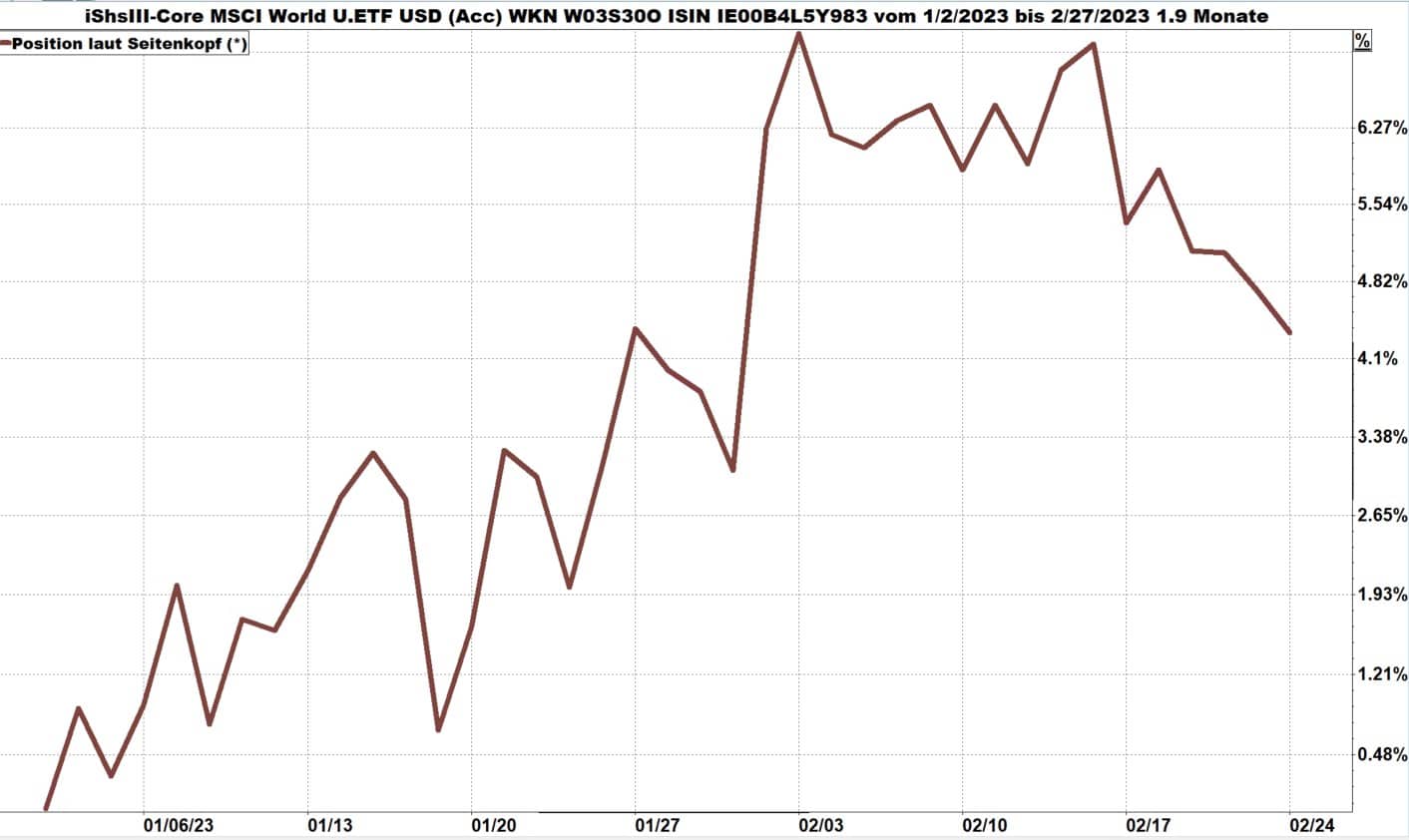 Zu Beginn des Jahres hellte sich die Stimmung an den Aktienmärkten deutlich auf. Die Investoren schalteten auf „Risk-On“ und erhöhten ihre Investments in Aktien. Der Weltaktienindex legte im ersten Monat um über 7 % zu. Der Februar begann zunächst mit einer Seitwärtsbewegung. Seit Mitte Februar gab der Weltaktienindex einen Teil des vorausgegangenen Anstiegs wieder ab. Grafik: Weltaktienindex, hier über einen ETF von iShares dargestellt, vom 3.1. bis 24.2.2023. Darstellung in Euro.