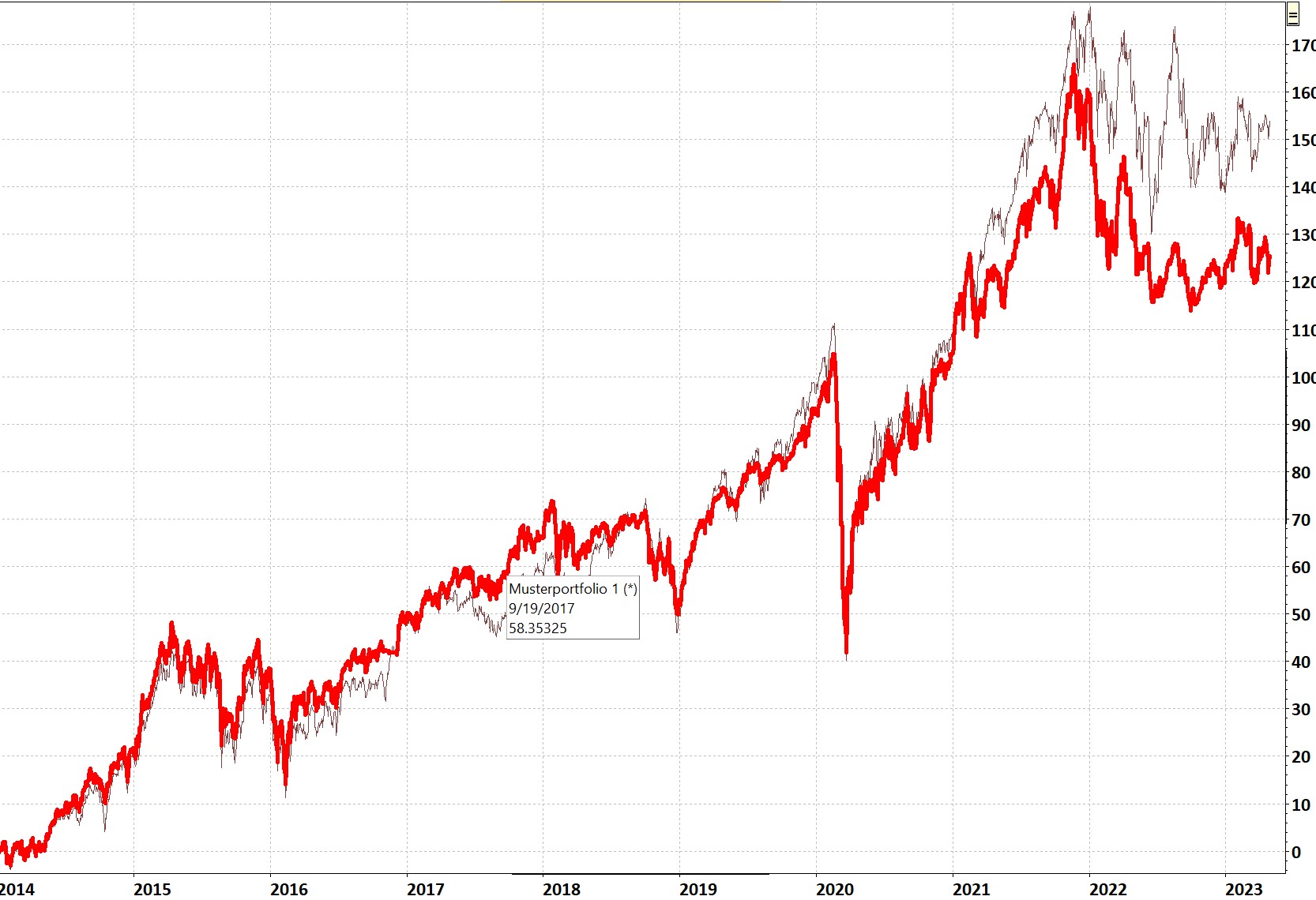 - dünne braune Linie: Wertentwicklung Weltaktienindex
