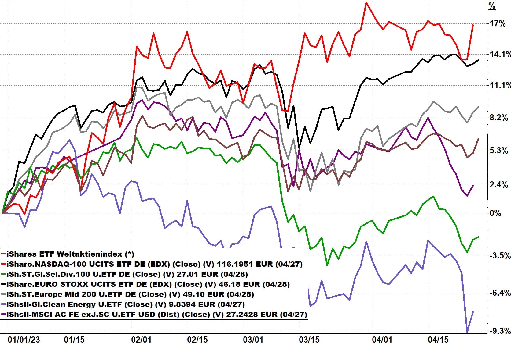 Grafik: ETF auf den Weltaktienindex von Anfang 2023 bis 28.04.2023, Darstellung in Euro. Monat April gelb hervorgehoben