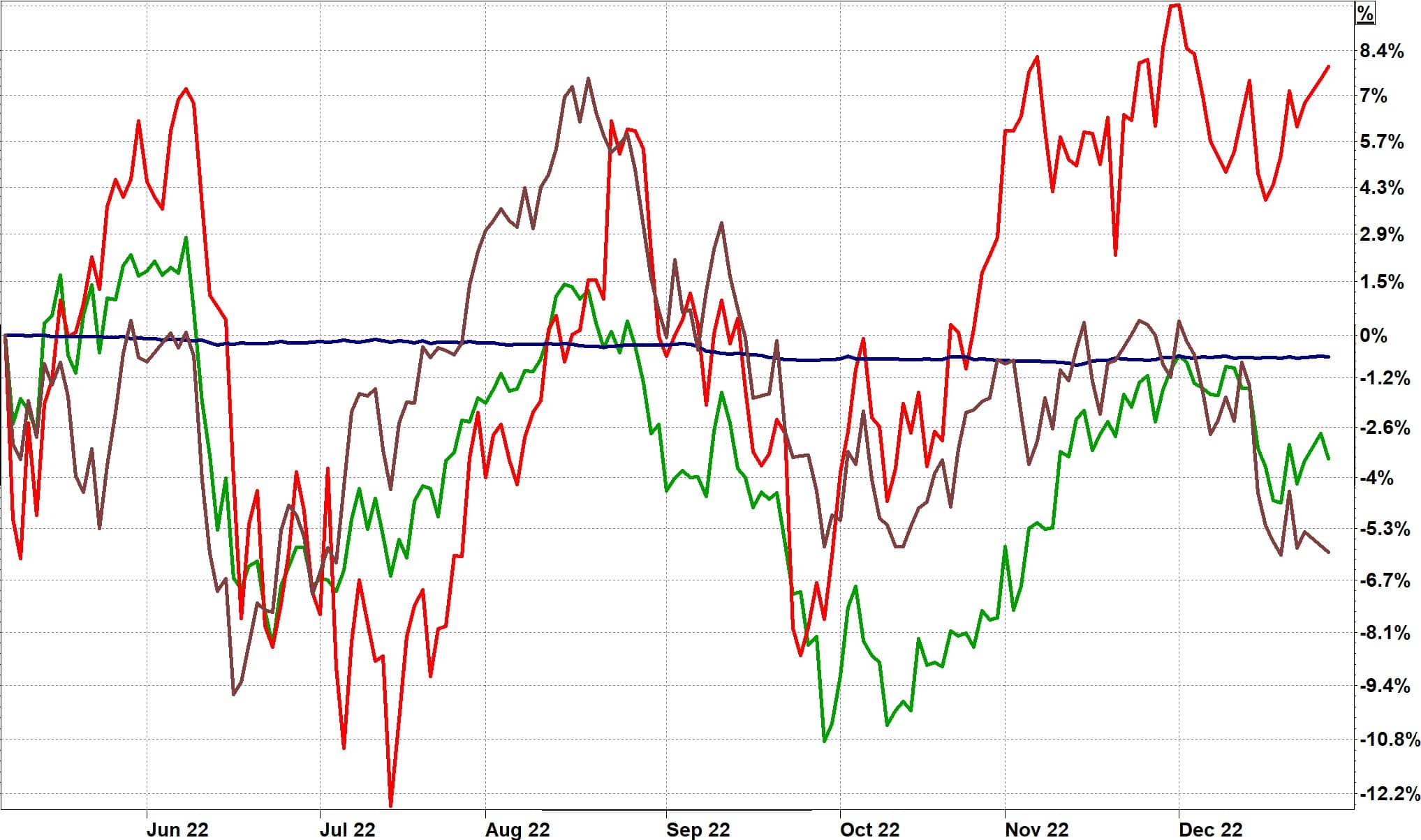 Grafik: Entwicklung der vier Positionen in Musterportfolio 3 vom 6.5. bis 28.12.2022, Bewertung in Euro