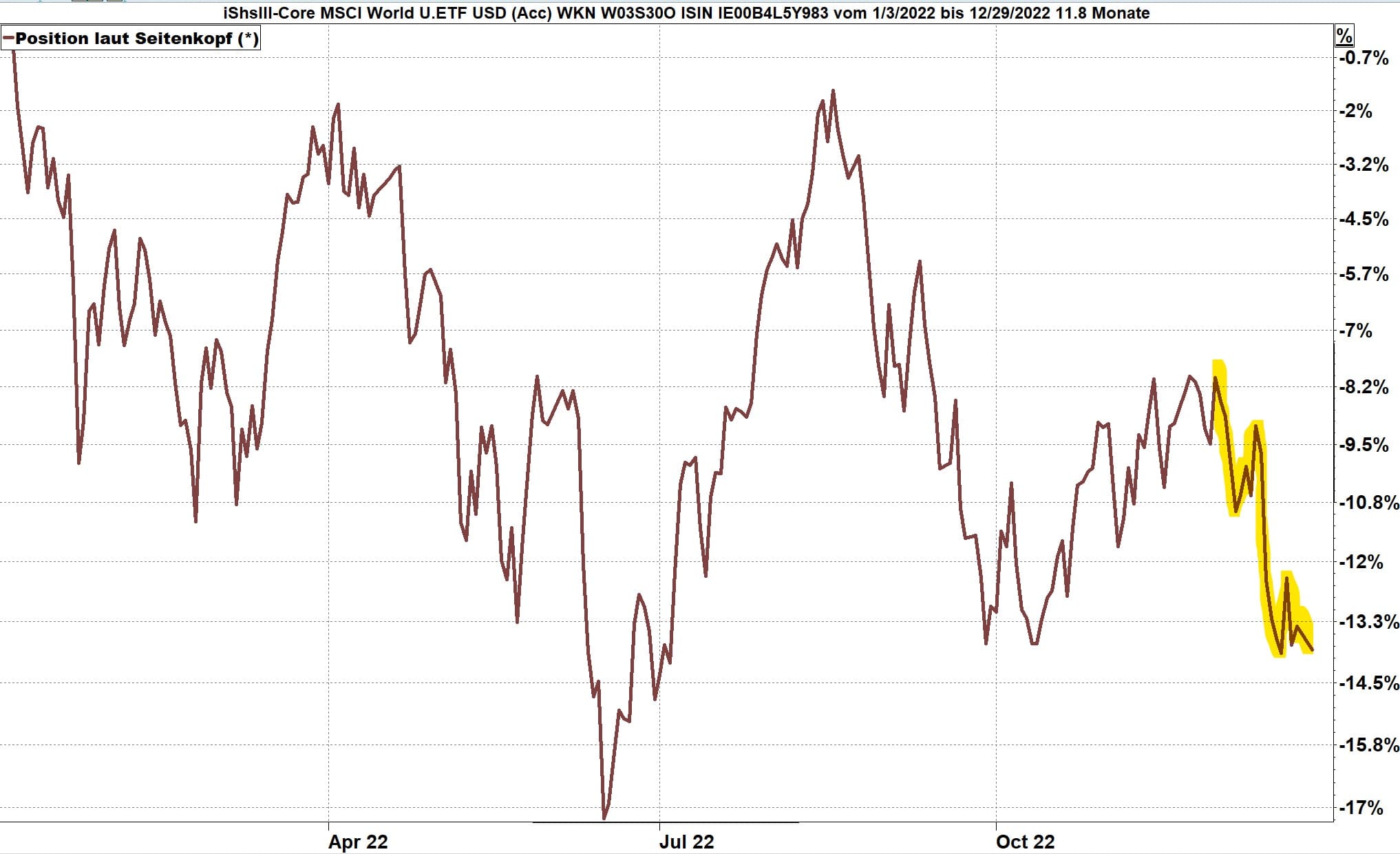 Grafik: Weltaktienindex, hier über einen ETF von iShares dargestellt, vom 3.1. bis 28.12.2022. Die Wertentwicklung im Dezember ist gelb hervorgehoben. Darstellung in Euro.