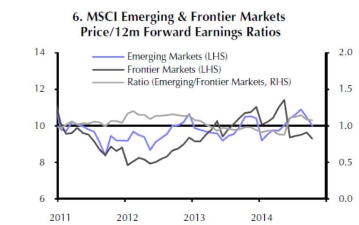 Noch günstiger als die „Emerging Markets“ scheinen die „Frontier Markets“ bewertet (siehe rechte Grafik). Dies sind genau die Rahmenbedingungen, die ein langfristig ausgerichteter Investor sucht, um sein Engagement in diesen Märkten auszubauen.