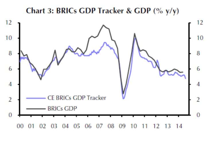 Das Wachstumstempo der Non-BRICs, somit die kleineren Staaten der Emerging Markets, ging dagegen weniger zurück. (siehe rechte Grafik).