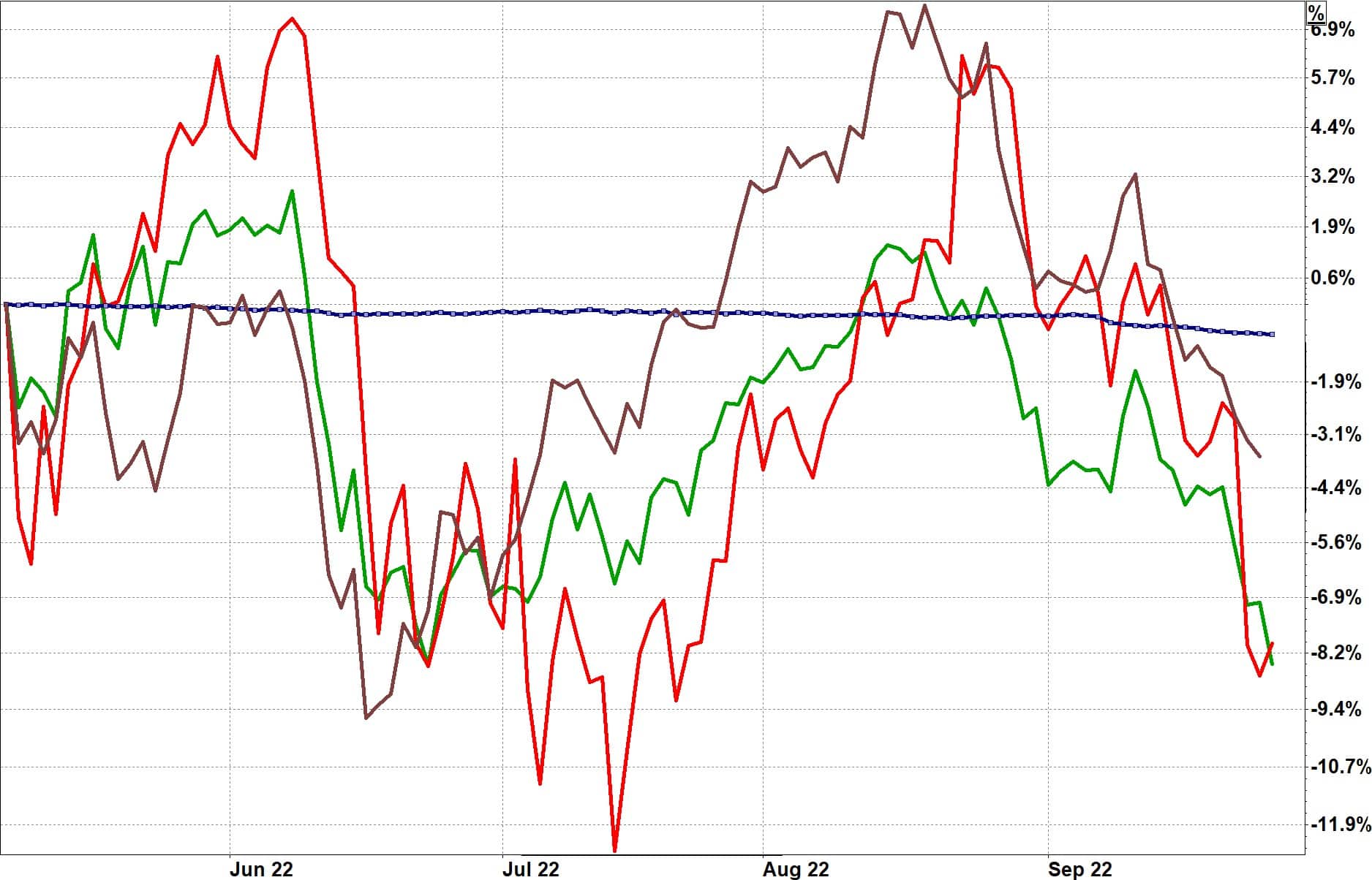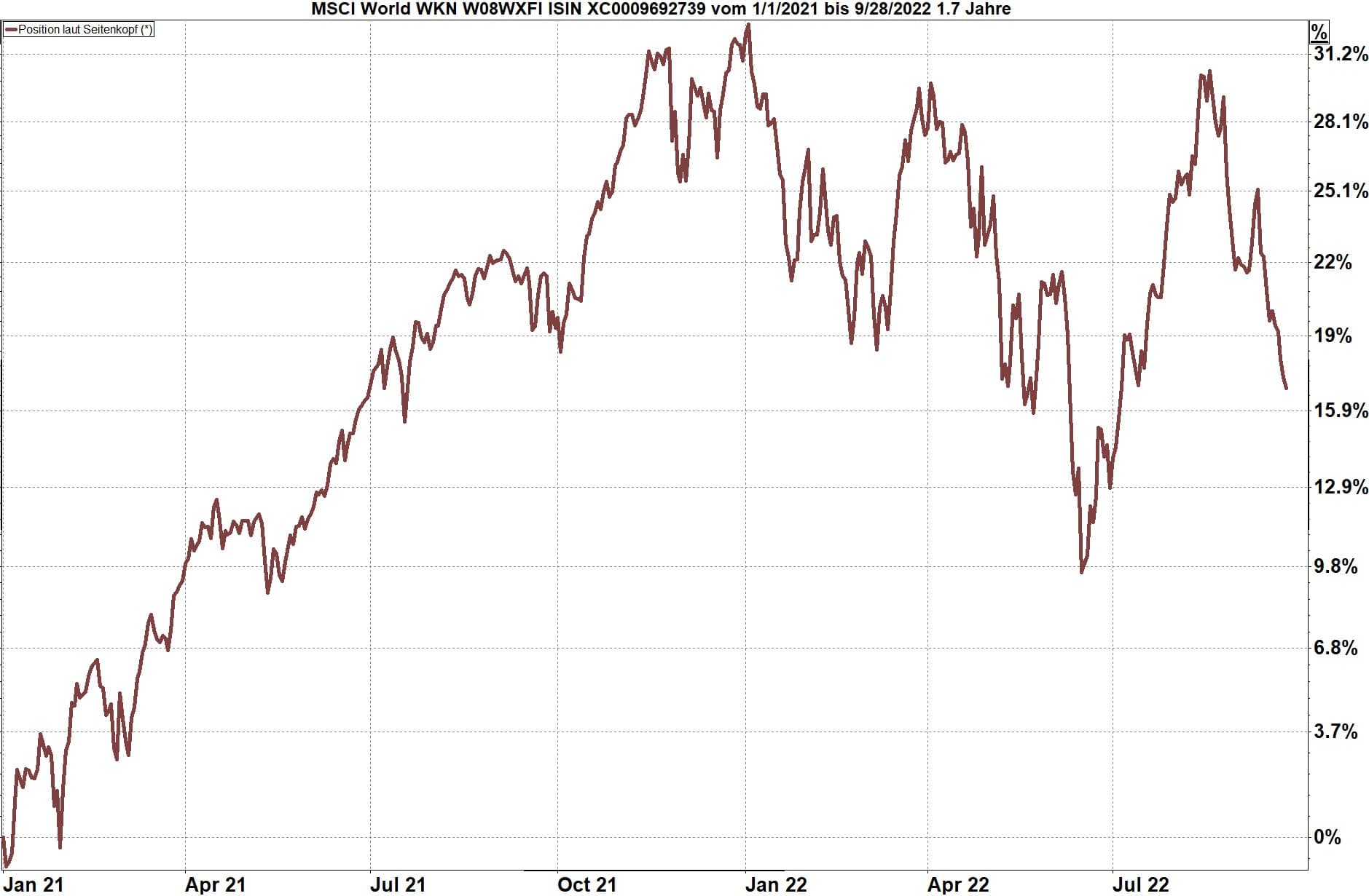 Die Erwartung, dass der Rückgang der Aktienkurse alsbald ein Ende finden würde, hat sich bis Ende September 2022 nicht erfüllt. Mit einem Anteil von nur nur 50 % in den Aktienmärkten (weitere 50 % in schwankungsfreien Kurzläufer-Staatsanleihen) nahm das Portfolio 3 den weiteren Rückgang nur sehr gebremst mit.