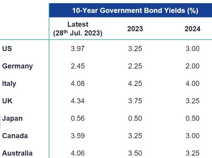 Diese Marktsituation wird nicht unbeschränkt lange anhalten. Die Inflationsraten gehen jenseits und diesseits des Atlantiks bereits wieder zurück. Die Notenbanken werden das Zinsniveau wieder senken. Die Möglichkeiten für Großanleger, attraktive Erträge auf dem Kapitalmarkt zu erzielen, werden wieder geringer. Dies wird dazu führen, dass beim Verkauf von großen Immobilienpaketen wieder höhere Preise erzielt werden. Hier die Prognose von „Capital Economics“, dem unabhängigen Analysedienst für wirtschaftliche Entwicklungen, mit den Zinssätzen für 10-jährige Staatsanleihen bis Ende 2024.