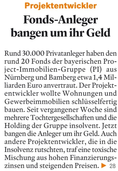 Jüngst wurden Anleger in Immobilienfonds durch Meldungen aufgeschreckt, dass ein großer Projekt-Entwickler in Bayern für einige seiner Fondsgesellschaften Insolvenz angemeldet hat. Die Meldungen verwenden teilweise das Kürzel „PI“ als Bezeichnung für die betroffene „Project-Immobilien-Gruppe“. Vorab in Kürze: Diese Gruppe ist nicht identisch mit der Fondsgesellschaft „PI – Pro Investor“, die sich auf den Kauf und die Sanierung von bestehenden Wohngebäuden fokussiert ist.