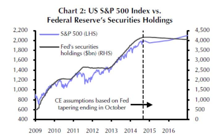 Wie werden sich die Kurse der US-Aktien weiter entwickeln, wenn im Herbst dieses Jahres das Anleihe-Kaufprogramm der Fed, das dem Markt laufend Liquidität zuführt, ausläuft? CAPIAL ECONOMICS (CE), der renommierte Analysedienst mit weltweitem Research, zweifelt daran, dass der breite S&P 500 weiterhin von einem Höchststand zum nächsten eilen wird. CE erwartet vielmehr, dass der S&P 500 Ende nächstes Jahr nahezu beim gleichen Stand liegen wird wie heute.