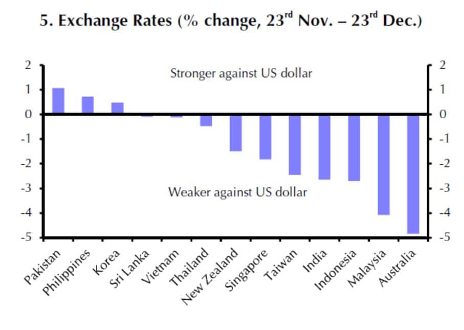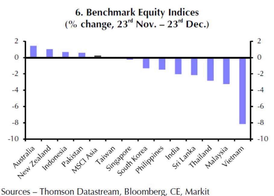 Die Wechselkurse gegen den USD gingen in den meisten Ländern von Emerging Asia im Dezember leicht zurück, am meisten in Malaysia und in Australien. (linke Grafik). Auch die Aktienkurse ließen etwas nach, am meisten in Thailand, Malaysia und Vietnam. (rechte Grafik). Aus eigener Recherche wissen wir jedoch, dass trotz einem zurückgehenden Index einige Fonds auch vor dem Hintergrund eines leicht zurückgehenden Index mit ihrer Einzeltitelauswahl bessere Ergebnisse erzielten. Für den in Euro denkenden Anleger zählt auch nicht die Wechselkursveränderung der EM-Währungen gegen den USD, sondern gegen den Euro. Da der Euro gegen die meisten EM-Währungen nur gering aufwertete, stellen sich die Euro-Anleger etwas besser als die USD-Anleger.