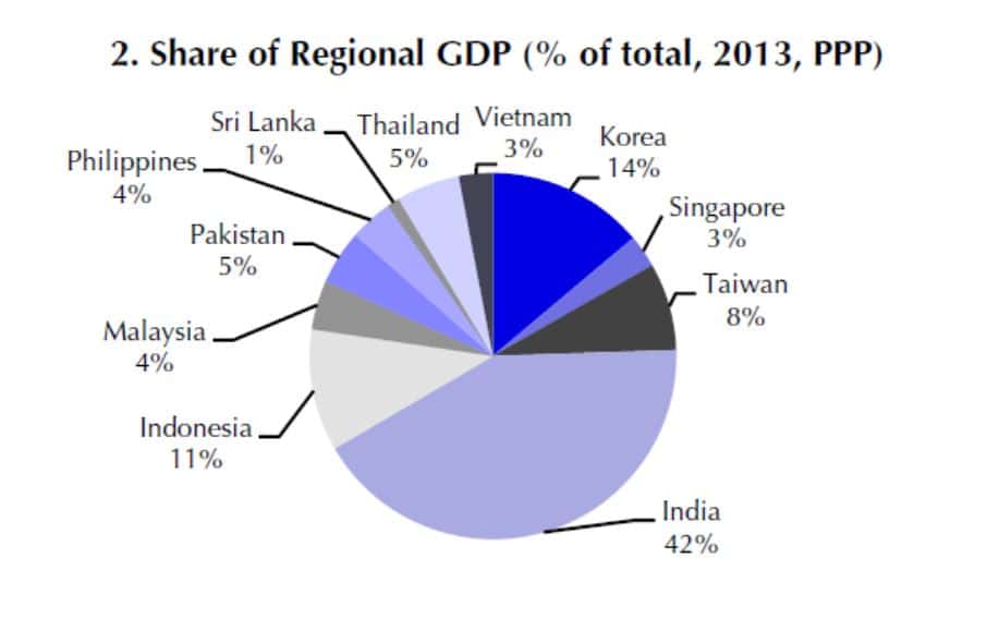 Indien, dann mit Abstand Korea und Indonesien, leisten den größten Beitrag zum GDP in Asien (ex China)