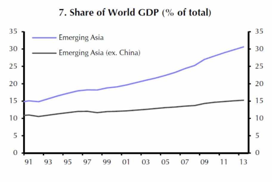Von 1991 bis 2013 stieg der Anteil der asiatischen Schwellenländer am Welt-Bruttosozialprodukt von 15 auf über 30 Prozent, wobei China zu dieser Entwicklung mit Abstand den größten Beitrag leistete. (linke Grafik) Der Anteil an den weltweiten Exportleistungen stieg synchron von 10 auf 24 Prozent, wobei auch hier der größte Anteil von China beigesteuert wurde. (rechte Grafik)