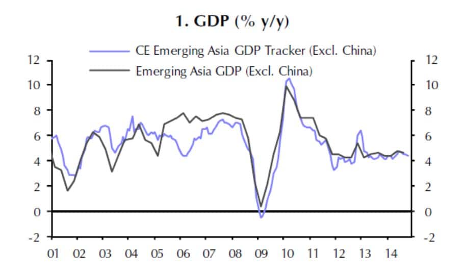 Das Wachstumstempo von Emerging Asia liegt weiterhin bei etwa vier Prozent, ging in jüngster Zeit jedoch leicht zurück.