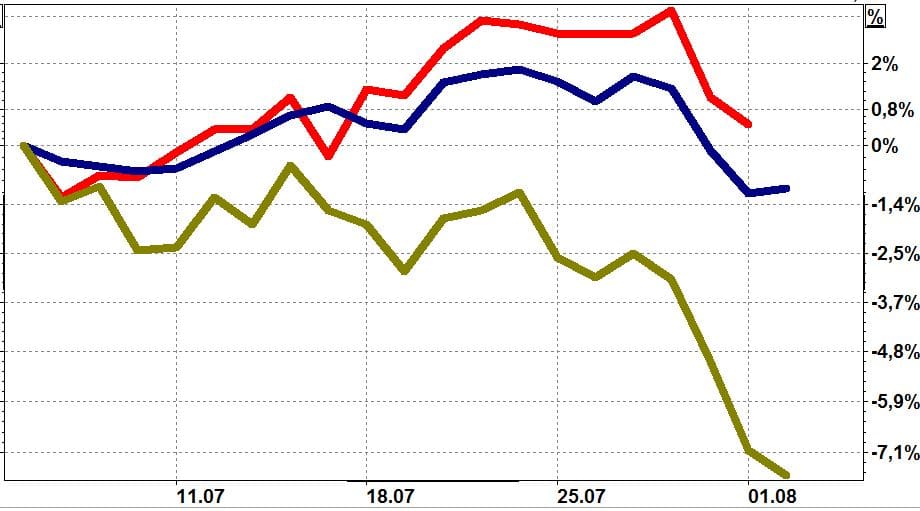 • Die beiden US-Indizes (rote und blaue Linie) legten bis Ende Juli noch etwas zu und fielen die letzten Tage um zwei bzw. drei Prozent.