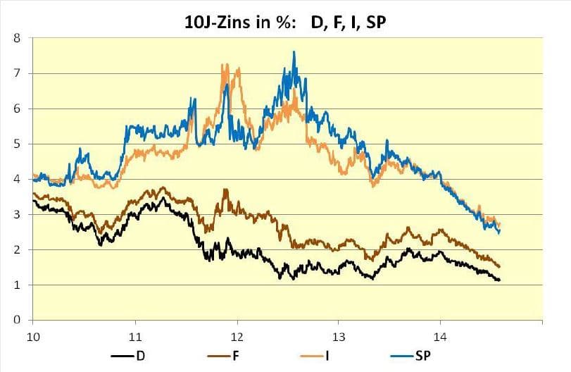 Die Renditen von Staatsanleihen in den USA liegen um die 2,5 Prozent, in Deutschland unter 1,5 Prozent. Auch in Frankreich liegt der Zinssatz für Staatsanleihen um die 1,5 Prozent, in Italien und Spanien nur knapp über 2,5 %. Marktkenner wie Dr. Früh (Tiberius Asset Management) raten zum Verkauf solcher Staatsanleihen.