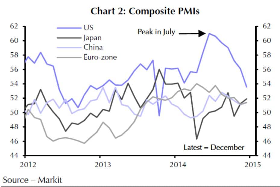 Die jüngsten Zahlen über das Wirtschaftswachstum weisen darauf hin, dass sich das Wachstumstempo der Weltwirtschaft im Dezember 2014 etwas verlangsamt hat.