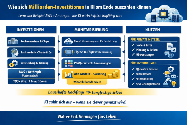 Fast jeden Tag erhalten wir neue Meldungen über gigantische Investitionen in KI-Rechenzentren und in die Entwicklung von KI-Anwendungen. Am Beispiel der am 20.6.26 bekanntgegebenen Zusammenarbeit zwischen AWS (Amazon Web Services) und Anthropic wird deutlich, wie durch das Zusammenwirken von Hardware (AWS-Rechenzentren) und Software (Anthropic KI-Modelle) Geld verdient werden kann.